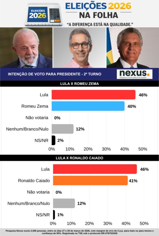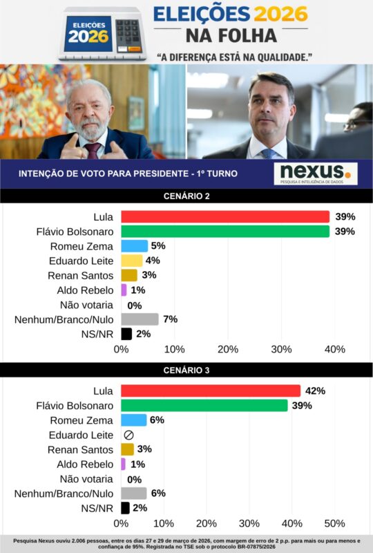 Nexus, Atlas e Quaest: Lula e Flávio empatados no segundo turno — A Nexus fez sua primeira rodada de pesquisa, sem comparação possível com anteriores pelo mesmo instituto. Mas seu resultado, com pequenas alterações numéricas, é muito semelhante à tendência revelada por outras pesquisas recentes. Em março, a AtlasIntel projetou um empate técnico no segundo turno: Flávio 47,6% a 46,6% Lula. No mesmo mês a Quaest trouxe outro empate exato ao segundo turno: Lula 41% a 41% Flávio.