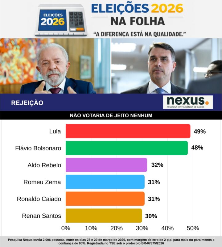Lula e Flávio lideram também rejeição — Índice considerado fundamental à definição do segundo turno, porque fixa o teto de crescimento dos dois candidatos que passarem pelo primeiro turno, a rejeição na pesquisa Nexus foi liderada por Lula: 49% dos brasileiros não votariam nele de jeito nenhum. Ele ficou em outro empate técnico e quase numérico com Flávio, com 48% de rejeição.