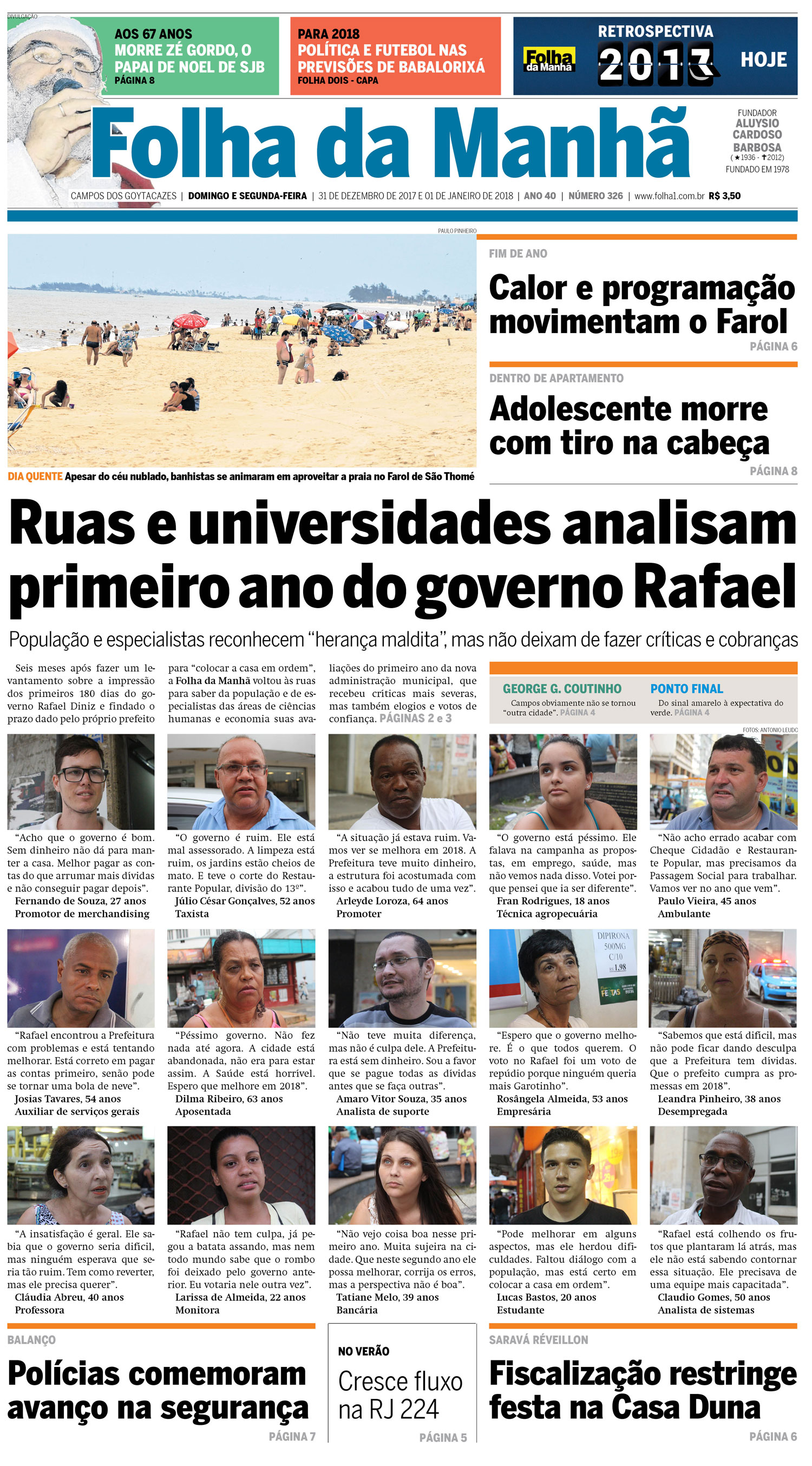 Obedecido o prazo de um ano dado pelo próprio Rafael, a Folha voltou a buscar a avaliação da população, numa enquete sem pretensão científica de pesquisa, além daqueles mesmos professores das ciências humanas que atuam do meio universitário de Campos, agora acrescidos também de especialistas em economia. E, ao final do primeiro ano do novo governo municipal, as críticas populares e acadêmicas parecem ter subido o tom. É o caso da análise do economista Alcimar das Chagas, professor da Universidade Estadual do Norte Fluminense (Uenf), ouvido pela primeira vez, que sustenta suas opiniões com números: