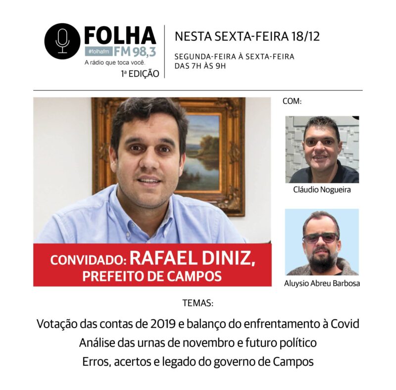 A partir das 7h da manhã desta sexta (18), quem encerra a semana do Folha no Ar, a 13 dias de encerrar seus quatro anos do governo de Campos, é o prefeito Rafael Diniz (Cidadania). Ele falará na Folha FM 98,3 sobre a votação das suas contas de 2019, com parecer técnico favorável do Tribunal de Contas do Estado (TCE), pela Câmara Municipal. E fará um balanço do enfrentamento à pandemia da Covid-19 em sua administração.