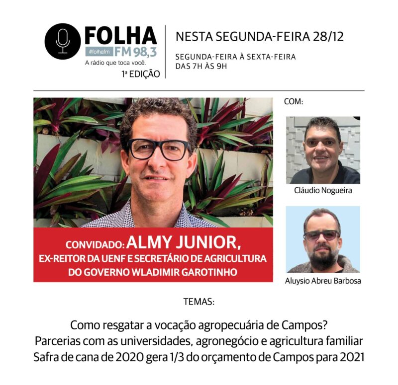 A partir das 7h da manhã desta segunda (28), o convidado do Folha no Ar será o professor Almy Junior, ex-reitor da Uenf e secretário de Agricultura confirmado (confira aqui) do governo eleito Wladimir Garotinho (PSD). Ele falará sobre o que pretende fazer para resgatar a vocação agropecuária de Campos, eixo econômico do município do séc. 17 até os anos 1990, e desde então abandonada pelo dinheiro fácil do petróleo.