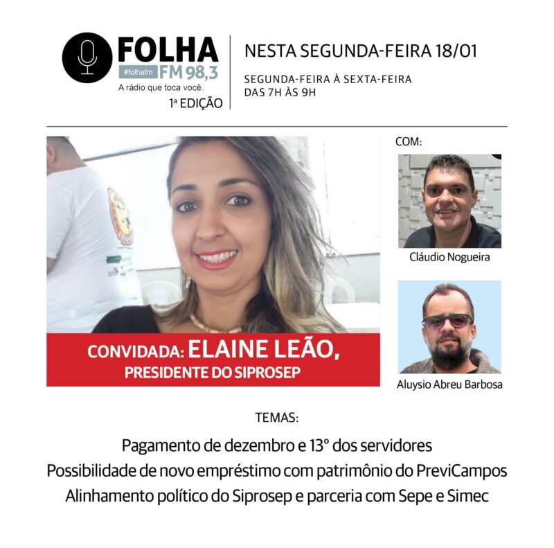Elaine falará também da possibilidade de uma nova tomada de empréstimo ao município a partir do patrimônio do PreviCampos, como foi aventado por Wladimir no Folha no Ar. E do alinhamento político do Siprosep, bem como da sua atuação institucional em conjunto com o Sindicato Estadual dos Profissionais da Educação (Sepe) e com o Sindicato dos Médicos de Campos (Simec) em defesa dos servidores municipais.