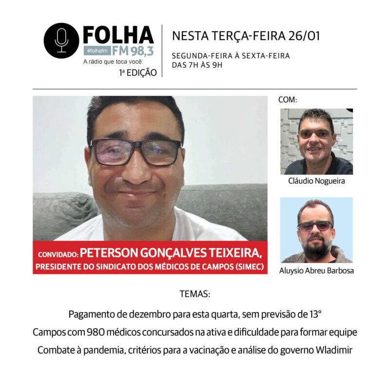 A partir das 7h da manhã desta terça (26), o convidado do Folha no Ar, na Folha FM 98,3, é o médico Peterson Gonçalves Teixeira, presidente do Sindicato dos Médicos de Campos (Simec). Ele falará sobre o pagamento dos salários atrasados de dezembro aos servidores, incluindo médicos e profissionais, anunciado (confira aqui) para esta quarta (27), mas ainda sem previsão para o 13º.