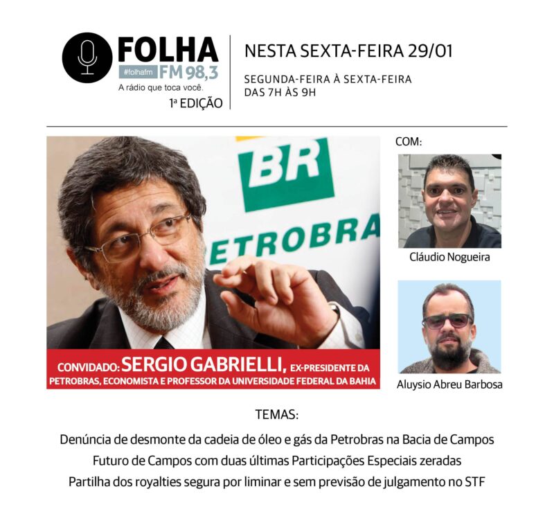 A partir das 7h da manhã desta sexta (29), quem fecha a semana do Folha no Ar, na Folha FM 98,3, é o economista Sergio Gabrielli, presidente da Petrobras entre 2005 e 2012, nos governos petistas Lula e Dilma Rousseff, e professor licenciado da Universidade Federal da Bahia. Ele falará sobre as denúncias de desmonte da cadeia de óleo e gás da Petrobras na Bacia de Campos.