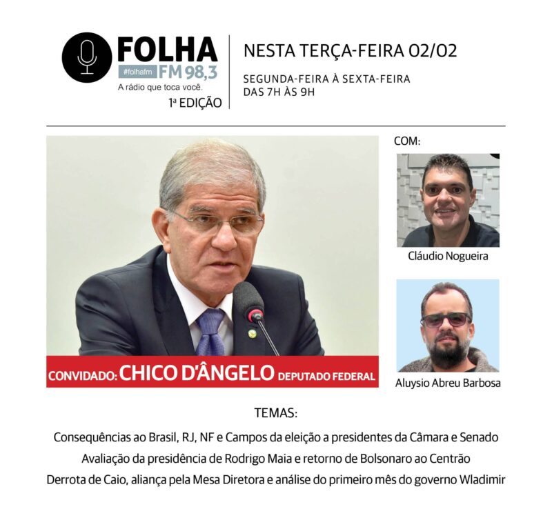 A partir das 7h desta terça (02), o Planalto Central abre a manhã da planície goitacá, quando o Folha no Ar recebe como convidado da Folha FM 98,3 o deputado federal Chico D’Ângelo (PDT/RJ). Campista de nascimento e radicado em Niterói, o experiente parlamentar falará das consequências das eleições a presidência da Câmara e do Senado (confira aqui e aqui), realizadas hoje (01), para o Brasil, o Estado do Rio, o Norte Fluminense e Campos.