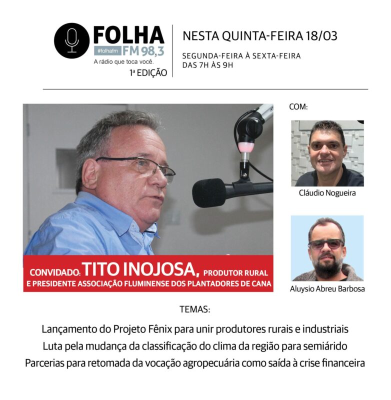 A partir das 7h da manhã desta quinta (18), o convidado do Folha no Ar, na Folha FM 98,3, será o produtor rural Tito Inojosa, presidente da Associação Fluminense dos Plantadores de Cana (Asflucan). Ele falará do lançamento do projeto Fênix (confira aqui, aqui e aqui), que vida reunir e fortelecer os produtores rurais e industriais da região. Ele falará também da luta pela mudança do clima do Norte e Noroeste Fluminense para semiárido, projeto como deputado federal (confira aqui) do atual prefeito de Campos, Wladimir Garotinho (PSD), que facilitaria linhas de acesso a crédito aos produtores rurais de 22 municípios.