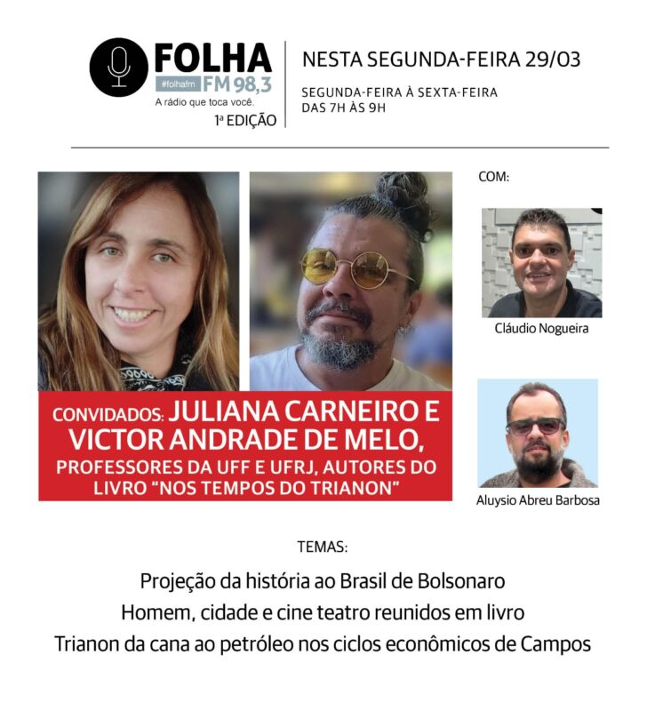 A partir das 7h da manhã desta segunda (29), quem abre a semana do Folha no Ar são os historiadores Juliana Carneiro e Victor Andrade de Melo. Ela, campista e professora da UFF; ele, carioca e professor da UFRJ; são ambos autores do livro “Nos Tempos do Trianon — Campos de diverte!” (confira aqui). Os dois começarão tentando projetar pela História o Brasil de Bolsonaro.