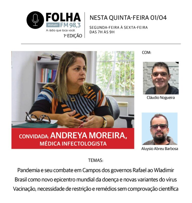 A partir das 7h da manhã desta quinta, a convidada do Folha no Ar, na Folha FM 98,3, será a médica infectologista Andreya Moreira. Chefe de Vigilância em Saúde no governo Rafael Diniz (Cidadania), cargo em que foi substituída no governo Wladimir Garotinho (PSD) por seu colega infectologista Charbell Kury, Andreya falará sobre a pandemia da Covid-19 em Campos e seu combate entre as duas administrações municipais.