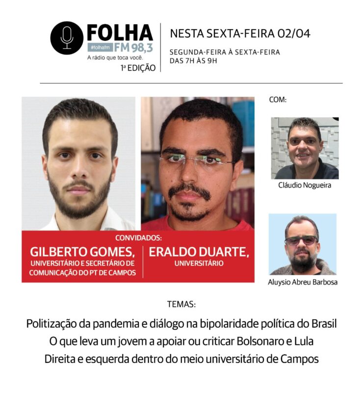 A partir das 7h da manhã desta sexta (02), quem fechará a semana do Folha no Ar, na Folha FM 98,3, são dois jovens universitários da cidade, que habitam em campos políticos em extremos opostos: o socialista Gilberto Gomes, estudante de Administração Pública na Uenf e secretário de Comunicação do PT de Campos; e o conservador e liberal Eraldo Duarte, estudante de Ciências Sociais na UFF.