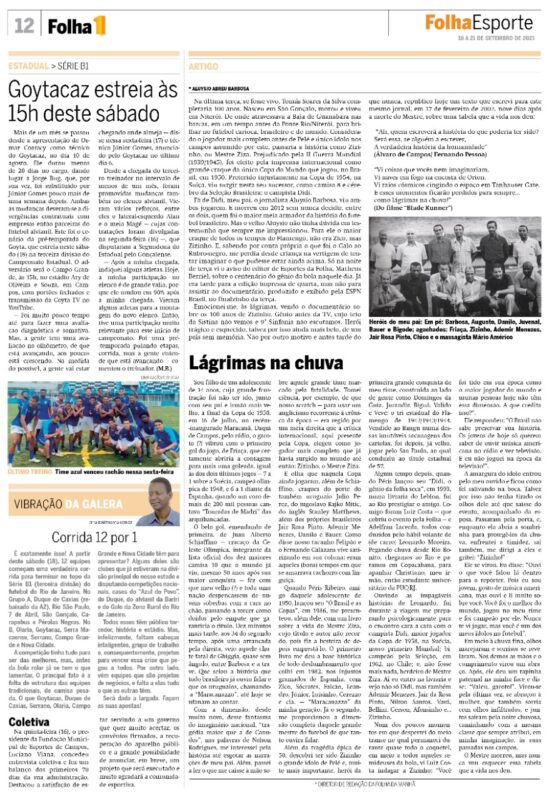 Só na noite de terça vi o aviso do editor de Esportes da Folha, Matheus Berriel, sobre o centenário de Zizinho naquele mesmo dia. Já era tarde para a edição impressa de quarta, mas não para assistir a um documentário, produzido e exibido pela ESPN Brasil, no finalzinho da terça. Emocionei-me, às lágrimas, vendo o especial sobre os 100 anos de Zizinho. Gênio antes da TV, cujo teto da Sistina não vemos e 9ª Sinfonia não escutamos. Herói trágico e esquecido, talvez por isso ainda mais belo, de um país sem memória.