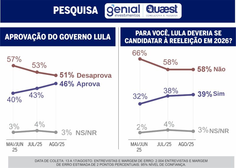 Igualmente feita entre 13 e 17 de agosto, com 2.004 eleitores brasileiros, a Quaest também aferiu números ruins a Lula. São 58% os que acham que ele não deveria se candidatar à reeleição. E, embora em tendência de queda, a desaprovação ao seu governo ainda se dá pela maioria numérica de 51%, contra os 46% em tendência de alta que aprovam.
