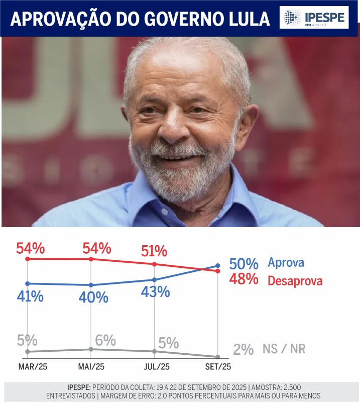 A Ipespe também mediu a aprovação dos três Poderes. No qual o Executivo comandado por Lula (PT) superou numericamente, ainda que no empate técnico na margem de erro, a desaprovação. De julho a setembro, a aprovação ao Lula 3 cresceu 7 pontos: de 43% aos atuais 50%. E a desaprovação caiu 3 pontos no mesmo período: de 51% aos 48% de hoje.