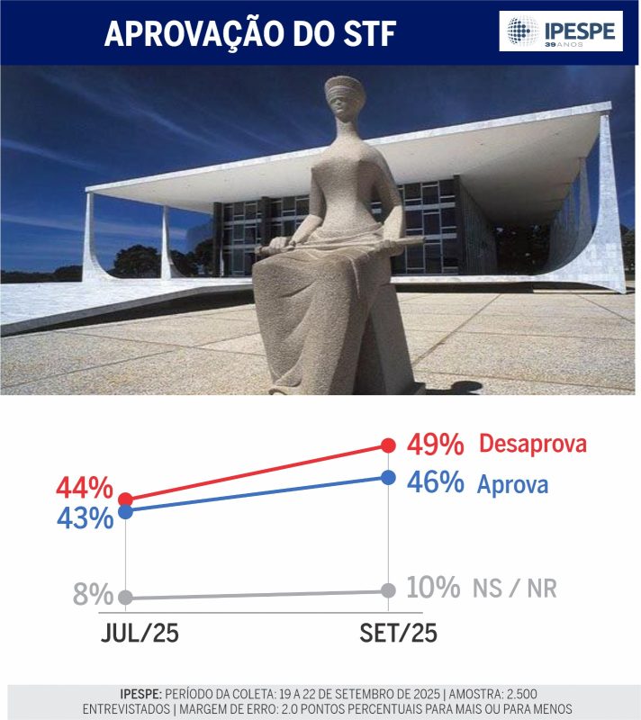 A Ipespe também mediu a opinião popular sobre o STF. Sua aprovação cresceu 3 pontos dos 43% de julho aos 49% de setembro, após a condenação (confira aqui) de Bolsonaro. No mesmo período de dois meses, a desaprovação do brasileiro ao STF recuou 5 pontos: de 49% aos 44% atuais.