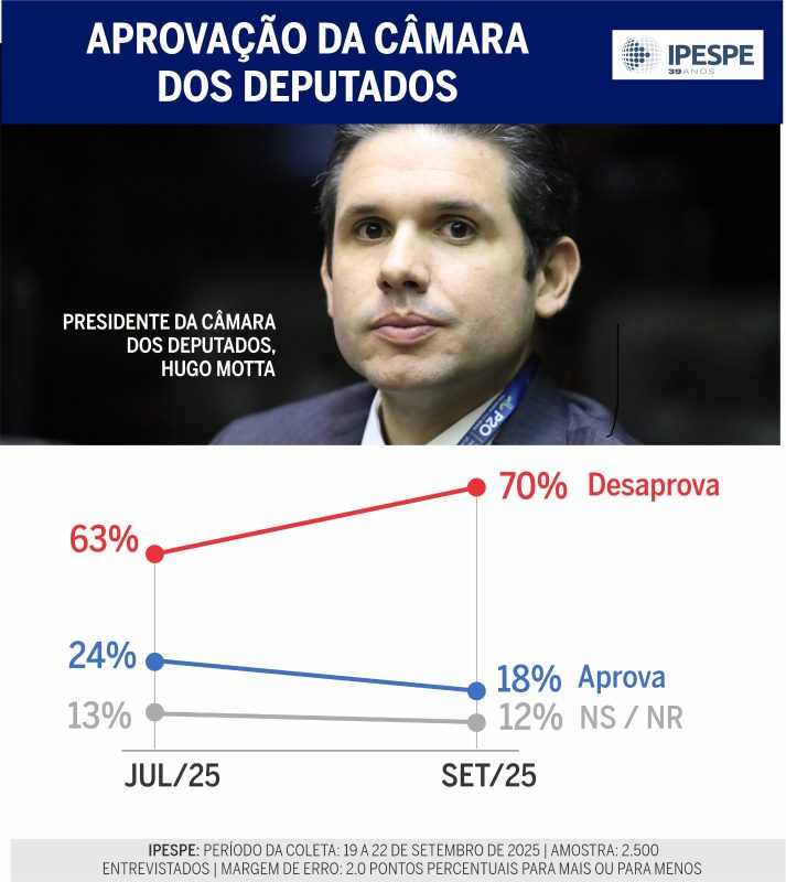 A pesquisa Ipespe também mediu que a Câmara dos Deputados cresceu 7 pontos na desaprovação: de 63% em julho a 70% dos brasileiros em setembro. A aprovação caiu 6 pontos: de 24% aos atuais 18%. “Ao motim no plenário em agosto, somou-se a PEC da Blindagem, produzindo um desgaste significativo na imagem da Câmara”, disse Lavareda.