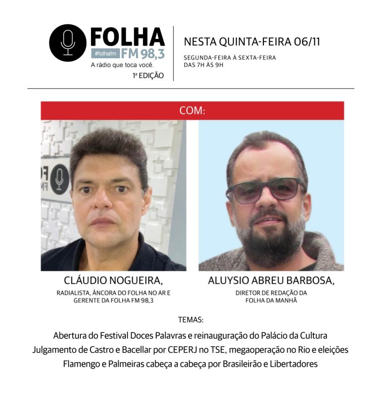 Estes serão os temas abordados, no Folha no Ar desta quinta (6), ao vivo, a partir das 7h da manhã, pelo radialista Cláudio Nogueira e o jornalista Aluysio Abreu Barbosa, na Folha FM 98,3.