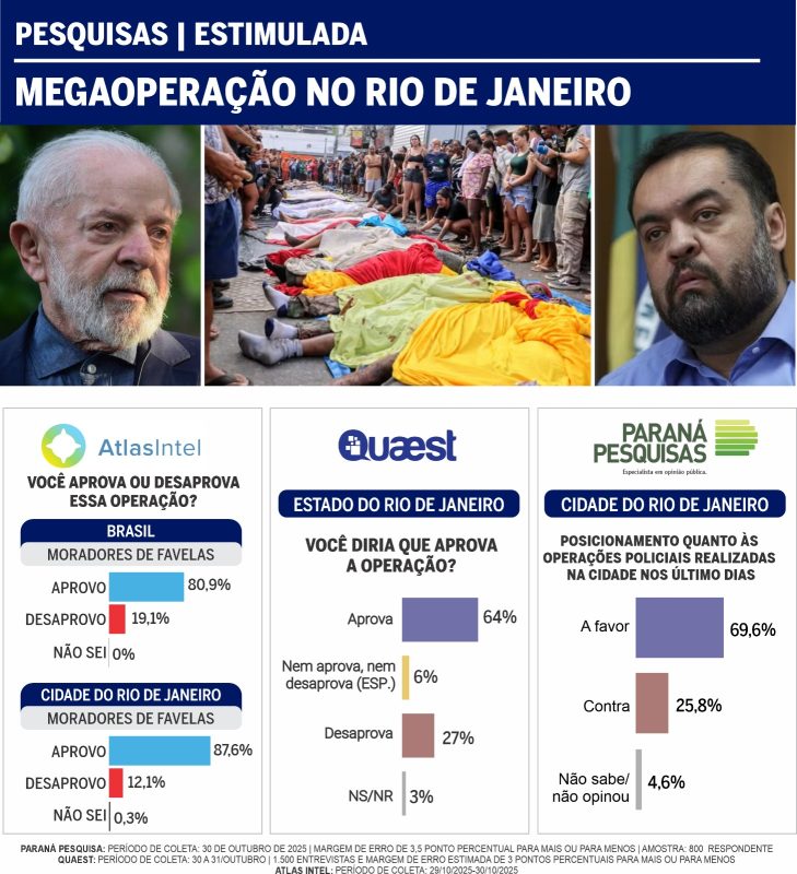 Divulgadas no final de semana, outras pesquisas. Feita apenas entre os eleitores do Estado do Rio, mas sem o recorte específico das favelas, a Quaest confirmou a maioria de 64% dos fluminenses aprova a operação. Que é desaprovada pela minoria de 27%, com 6% que nem aprovam, nem desaprovam.