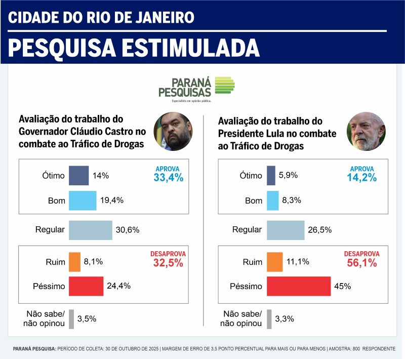 Na comparação direta entre os trabalhos de Castro e Lula no combate ao tráfico de drogas, a pesquisa Paraná na cidade do Rio revelou que o governador, hoje, tem aprovação de 33,4% dos cariocas (14,0% de ótimo e 19,4% de bom). São 19,2 pontos acima de Lula, hoje aprovado por apenas 14,2% dos cariocas (5,9% de ótimo e 8,3% de bom) no combate ao tráfico.