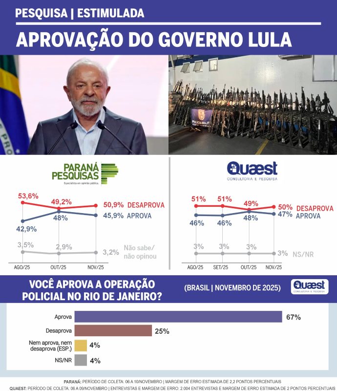 Análise do especialista — “Realizadas após a megaoperação do Rio, as pesquisas Quaest e Paraná confirmam piora da aprovação de Lula, com petista oscilando negativamente depois de melhora registrada em levantamentos anteriores. No que diz respeito à megaoperação apurada pela Quaest, 67% da população brasileira aprova a intervenção e não acha que a polícia exagerou na força empregada”, analisou William Passos, geógrafo com especialização doutoral em estatística no IBGE.