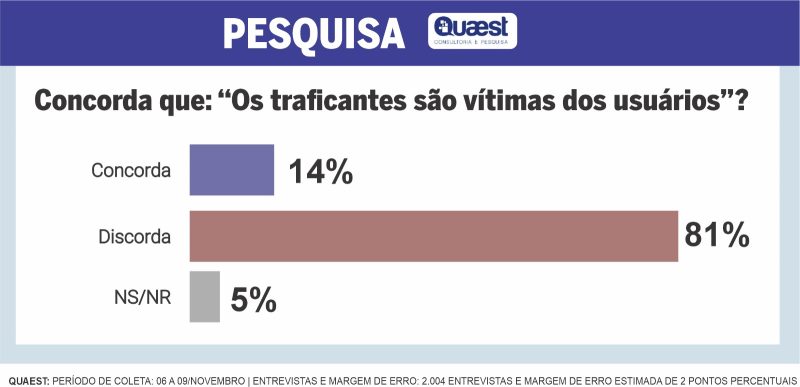 Diante da pergunta da Quaest, se concorda que “os traficantes são vítimas dos usuários”, a esmagadora maioria de 81% dos brasileiros discorda de Lula. Uma minoria de apenas 15% concorda, com 5% que não souberam responder.
