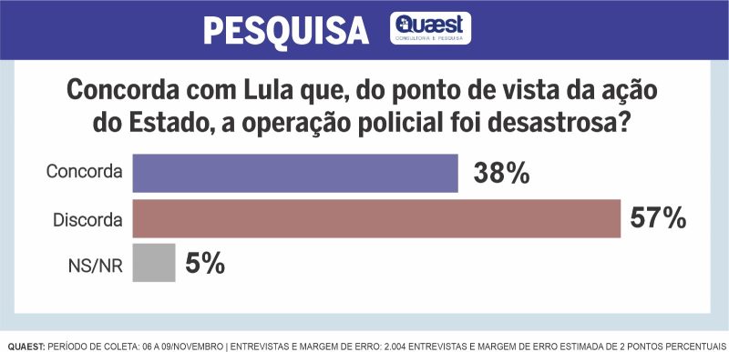 Sobre outra declaração de Lula, que também chamou a megaoperação de “desastrosa”, a maioria de 57% dos brasileiros discorda. Uma minoria de 38% concorda, enquanto 5% não souberam responder.