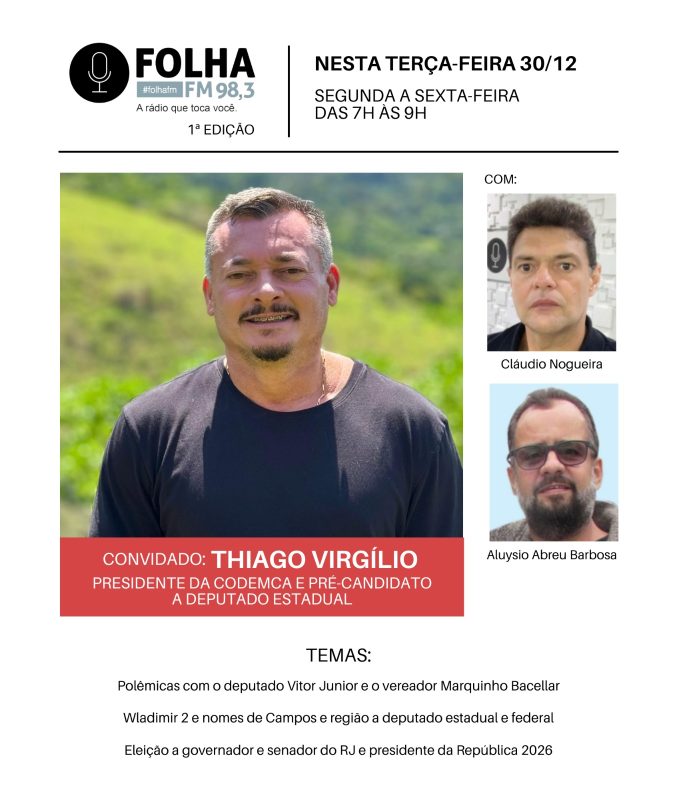 Presidente da Companhia de Desenvolvimento da Companhia de Campos (Codemca), presidente municipal e coordenador regional do Podemos e pré-candidato a deputado estadual, Thiago Virgílio é o convidado do Folha no Ar desta terça (30), ao vivo, a partir das 7h da manhã, no Folha no Ar.