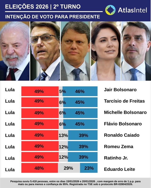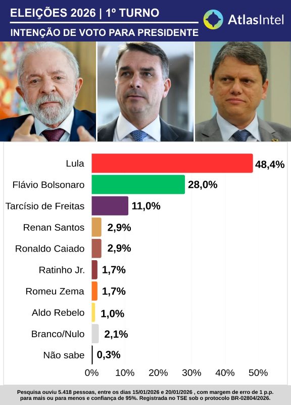 Ampla vantagem de Lula — Feita com 5.418 eleitores de 15 a 20 deste mês, com margem de erro de 1 ponto para mais ou menos e registrada no TSE sob protocolo BR 02804/2026, a pesquisa AtlasIntel revelou a ampla vantagem de Lula sobre os dois nomes da direita hoje mais cotados: o senador Flávio Bolsonaro (REP) e o governador de São Paulo, Tarcísio de Freitas (PSD).