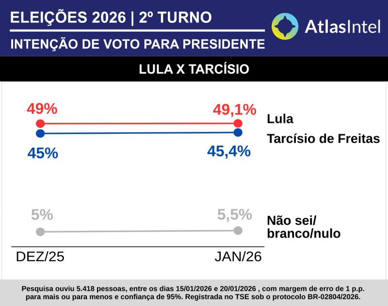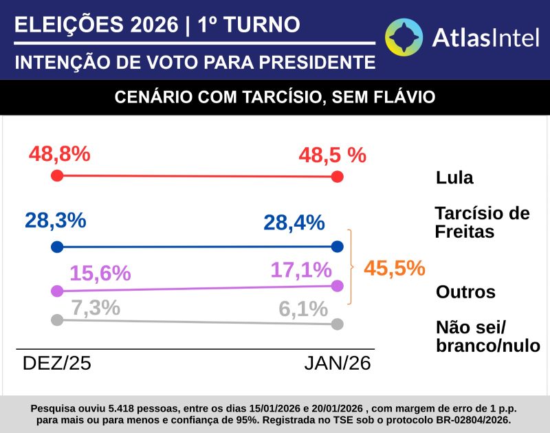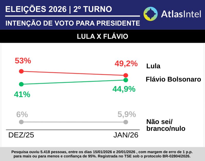 Lula e Tarcísio patinam e Flávio cresce ao 2º turno — Na comparação entre dezembro e janeiro da série AtlasIntel, Lula (49% a 49,1%) e Tarcísio (45% a 45,4%) passaram o último mês patinando nas intenções de voto ao 2º turno. Como nas simulações de 1º turno, só quem cresceu no mesmo período foi Flávio. Ele ganhou 3,9 pontos de intenção dos 41% de dezembro aos 44,9% de janeiro.