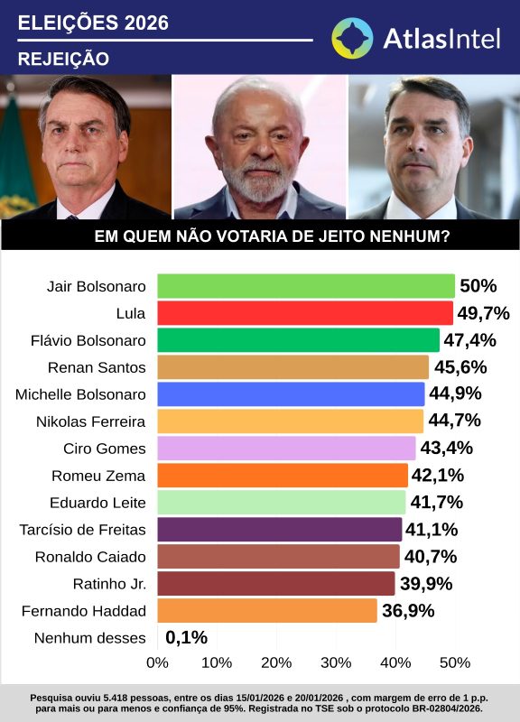 Rejeição que definirá o 2º turno — Índice mais importante à definição do 2º turno, por limitar o crescimento dos dois candidatos que o disputam, a rejeição na AtlasIntel foi liderada por Bolsonaro: 50,0% não votariam nele de jeito nenhum. Em 2º lugar, Lula tem 49,7% de rejeição. É um empate técnico com Bolsonaro e, hoje, o maior obstáculo à reeleição do petista.