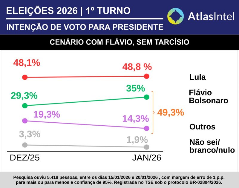 Flávio cresce e Lula patina ao 1º turno — Se os cenários são favoráveis a Lula, a comparação da série de pesquisas AtlasIntel revelou um ponto também favorável a Flávio: dos 29,3% que ele tinha de intenção ao 1º turno em dezembro, cresceu 5,7 pontos aos 35% de janeiro. No mesmo período, Lula patinou, oscilando 0,7 ponto para cima, dos 48,1% de dezembro aos 48,8% atuais.