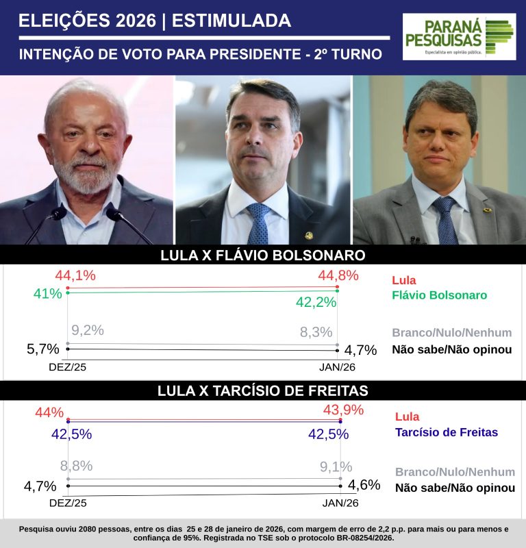 Nas simulações de 2º turno entre Lula e Tarcísio, o petista oscilou 0,1 para baixo no último mês: dos 44,0% de dezembro aos 43,9% de janeiro. Enquanto Tarcísio se manteve entre dezembro e janeiro nos mesmos 42,5% no 2º turno contra Lula. Na série de pesquisas Paraná, os dois também patinaram em números quase exatos no último mês.