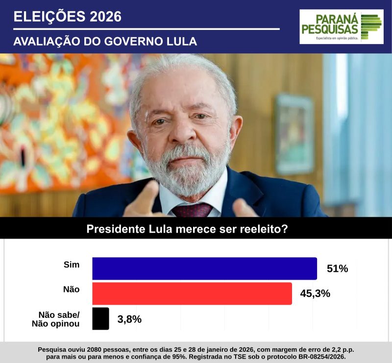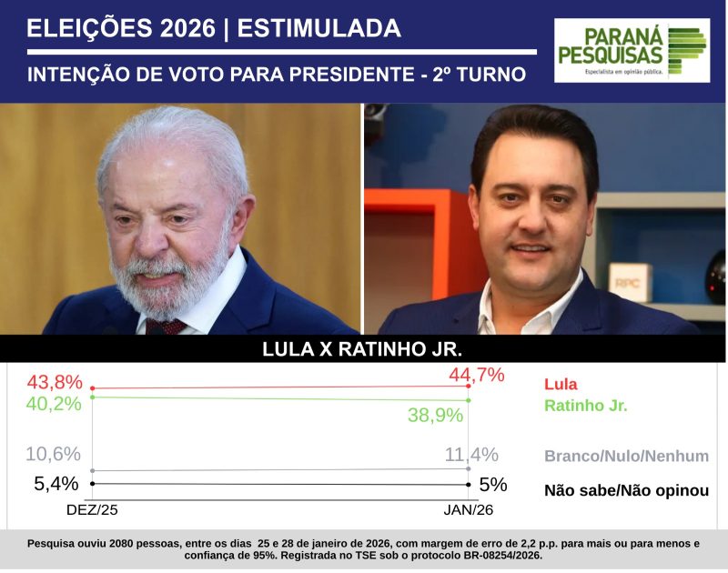 A única simulação de 2º turno, das três feitas pela pesquisa Paraná, em que Lula liderou acima da margem de erro foi contra o governador do Paraná, Ratinho Jr. (PSD): 44,7% do petista a 38,9%. Seriam 5,8 pontos de vantagem pela reeleição do presidente.