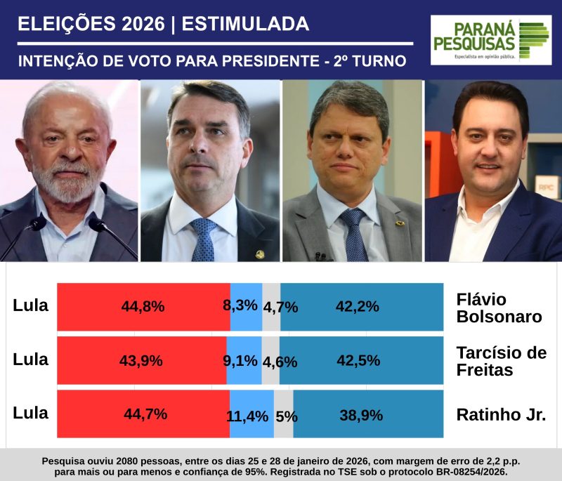 “A Paraná de janeiro testou dois cenários de 1º turno e três de 2º turno. Em todos, Flávio Bolsonaro e Tarcísio de Freitas são os adversários mais competitivos de Lula. A pesquisa deu empate técnico no 2º turno de Lula com os dois. O quadro, hoje, é de indefinição”, resumiu William Passos, geógrafo com especialização doutoral em estatística no IBGE.