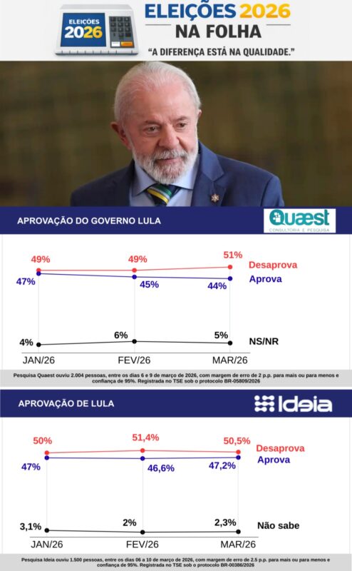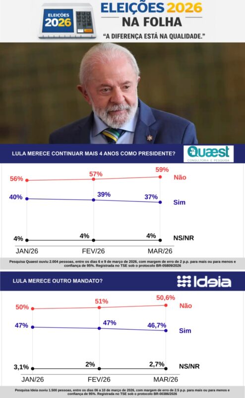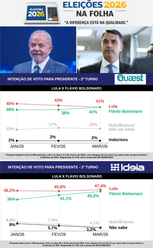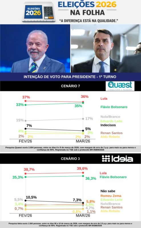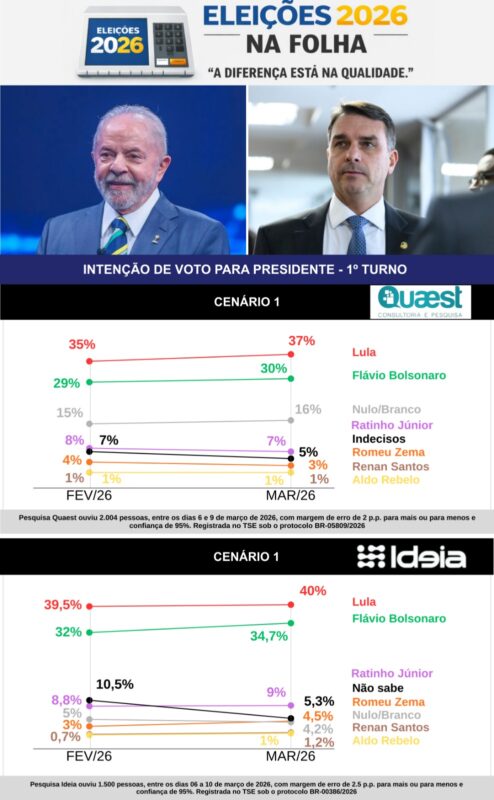 Dados das pesquisas — A Quest foi ouviu presencialmente 2.004 eleitores de todo o Brasil, de 6 a 9 de março, com registro BR-05809/2026 no Tribunal Superior Eleitoral (TSE). A Ideia ouviu através do telefone 1.500 eleitores de todo o Brasil, de 6 a 10 de março, com registro BR-00386/2026 no TSE.