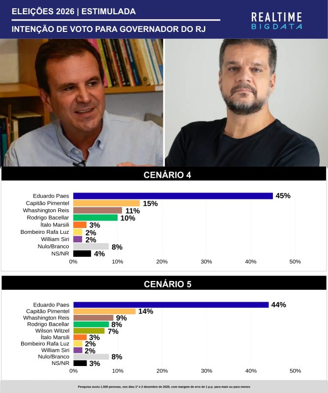 Nos cinco cenários estimulados da Big Data, com margem de erro de 3 pontos para mais ou menos, Paes variou entre 55% a 44% de intenção de voto a governador. Os dois únicos cenários em que ele não liquidaria a fatura no 1º turno têm o mesmo fator comum: o ex-capitão do Bope Rodrigo Pimentel (sem partido) foi colocado em ambos como pré-candidato.