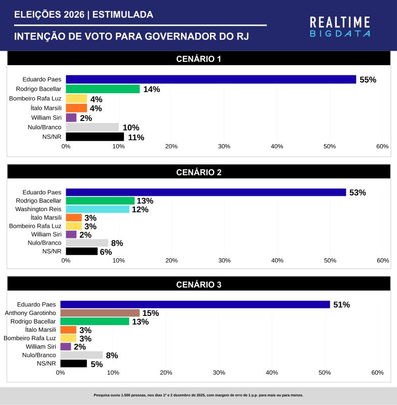 O maior problema da Big Data é que, então presidente da Alerj, Rodrigo Bacellar (União) teve de 14% a 8% de intenção nos cinco cenários a governador, variando na 2ª à 4ª posição. Mas, por determinação do ministro do Supremo Tribunal Federal (STF) Alexandre de Moraes, o político de Campos seria preso preventivamente (confira aqui, aqui e aqui) no dia 3, seguinte à conclusão da pesquisa.