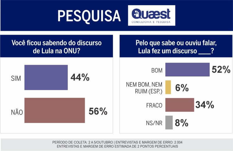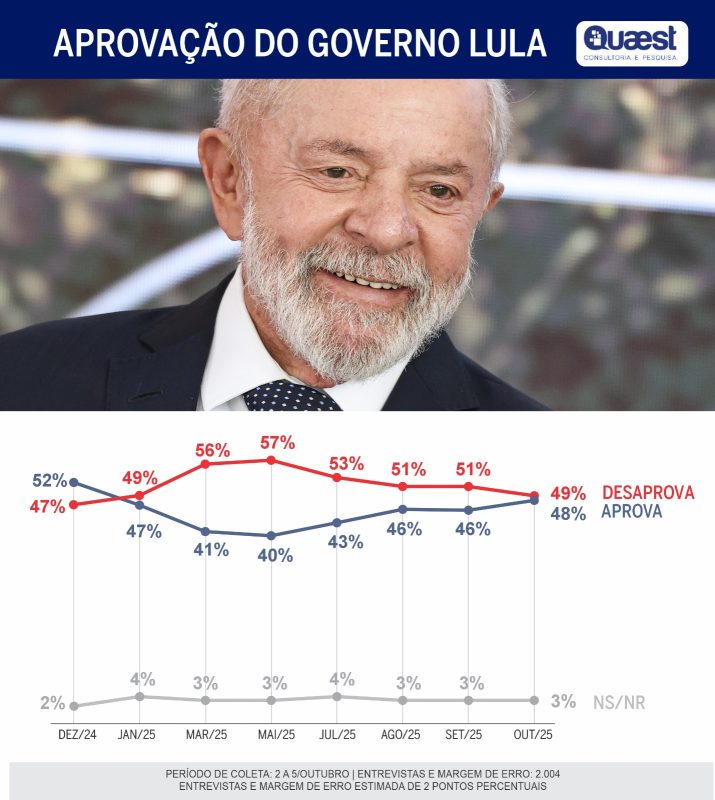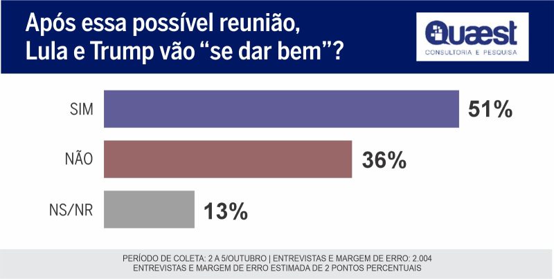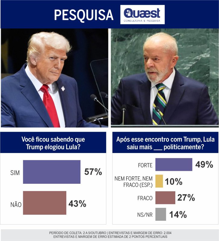 — E depois ainda teve a conversa por videoconferência entre os dois, na segunda desta semana, já em 6 de outubro. Que a Quaest, feita de 2 a 5 de outubro, nem pegou. Pelo estilo errático de Trump, nada pode ser descartado. Nem a humilhação que ele impôs a Zelensky na Casa Branca. Mas se Lula conseguir derrubar as tarifas ao Brasil e tirar a aplicação da Lei Magnitsky de cima de Moraes e da mulher, vai crescer ainda mais nas pesquisas a 2026.