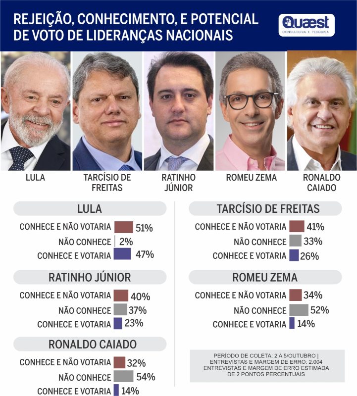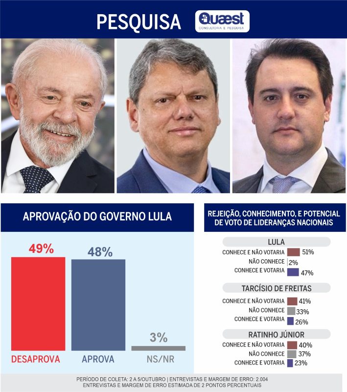 — Isso eu sou obrigado a reconhecer. Naquela Quaest de junho, Lula não passava do empate técnico na simulação de 2º turno não só com um Bolsonaro inelegível, mas também com Tarcísio, Michelle, Ratinho Junior e Eduardo Leite.