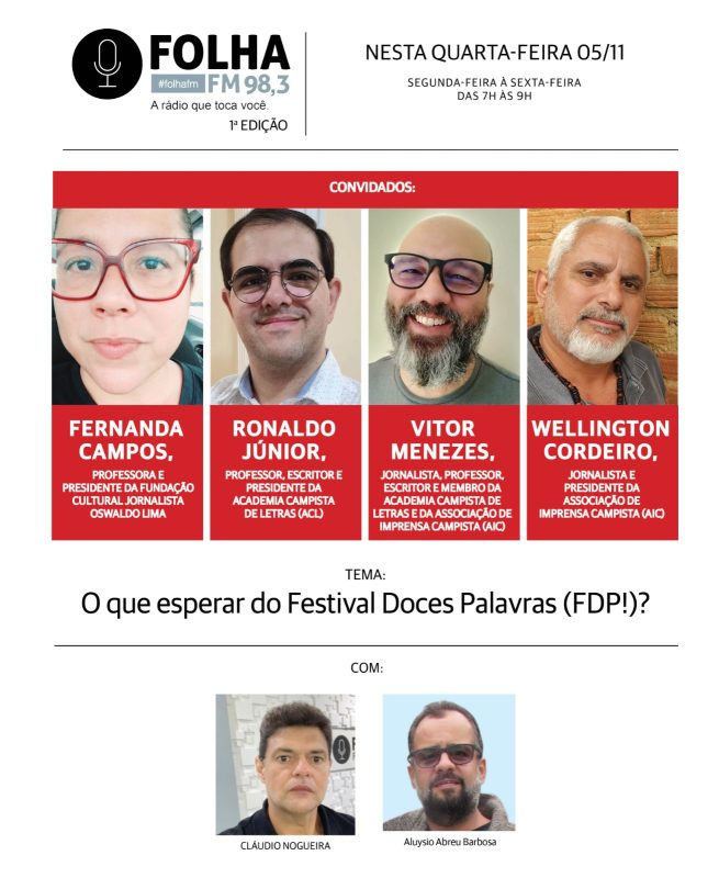 Fernanda Campos, Ronaldo Junior, Vitor Menezes e Wellington Cordeiro são os convidados do Folha no Ar desta quarta (5), ao vivo, a partir das 7 da manhã, na Folha FM 98,3.