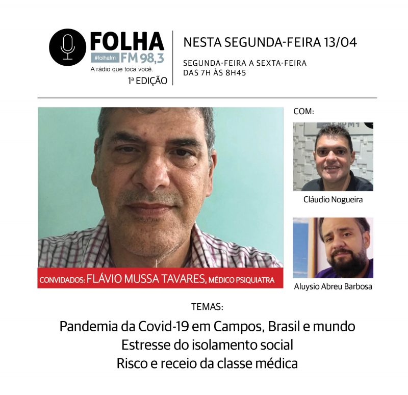 A partir das 7h da manhã desta segunda-feira (13), o convidado do Folha no Ar é o médico psiquiatra Flávio Mussa Tavares. Ele falará ao vivo na Folha FM 98,3 da pademia da Covid-19 em Campos, no Brasil e no mundo, do estresse do isolamento social e dos riscos e receios entre os profissionais de saúde, na linha de frente do combate ao novo coronavírus.