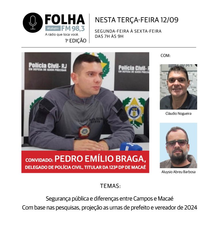 “A pacificação (entre Garotinhos e Bacellar) é delicada. Há contraposição natural entre os dois grupos. E temos uma eleição a prefeito no ano que vem. É quase uma obrigação combater o grupo adversário, se você quer se estabelecer dentro do território original de ambos, que é um só. Mas esse enfrentamento precisa existir com maturidade, cada um mostrando o que propõe e fazendo política. Não tem que haver enfrentamento carnal, mais pessoal. Que é algo que não enriquece em nada o debate, só atrapalha”. Foi o que advertiu no Folha no Ar da manhã de ontem o delegado de Polícia Civil Pedro Emílio Braga, campista titular da 123ª DP de Macaé.