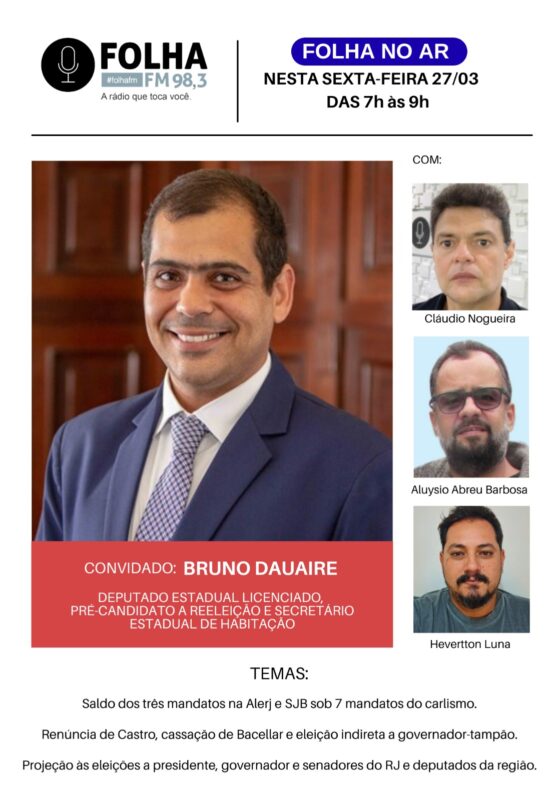 Deputado estadual licenciado, pré-candidato à reeleição e secretário estadual de Habitação, Bruno Dauaire (União) é o convidado para fechar a semana do Folha no Ar nesta sexta (27), ao vivo, a partir das 7h da manhã, na Folha FM 98,3. Ele analisará, entre erros e acertos, o saldo dos seus três mandatos consecutivos na Alerj e de São João da Barra sob sete mandatos consecutivos do carlismo na Prefeitura.