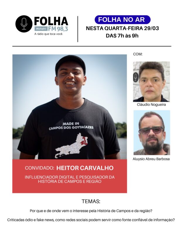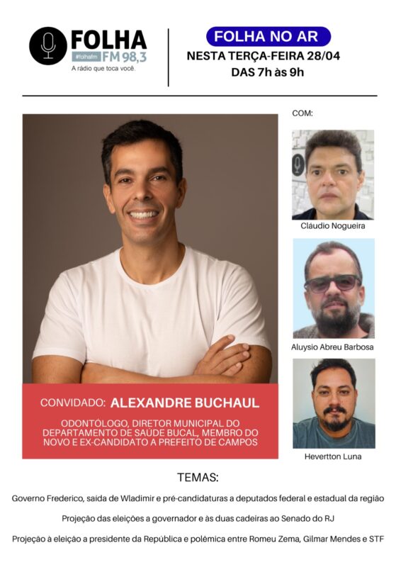 Novo prefeito de Campos, empossado (confira aqui) no último dia 2, Frederico Paes (MDB) é o convidado para fechar a semana do Folha no Ar nesta sexta (10), ao vivo, a partir das 7h da manhã, na Folha FM 98,3.