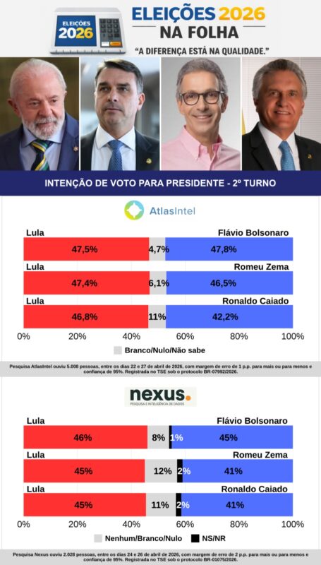 Ideia de abril com Flávio também à frente — Além da Quaest e Datafolha, outra pesquisa deste mês de maio, diferente da MDA, revelou Flávio numericamente à frente de Lula, mas também em empate técnico na projeção de segundo turno. Foi (confira aqui) a Ideia: Flávio 45,8% a 45,5% Lula. Ela foi feita de 3 a 7 de abril, com 1.500 eleitores, margem de erro de 2,5 pontos para mais ou menos e registro BR-00605/2026 no TSE.