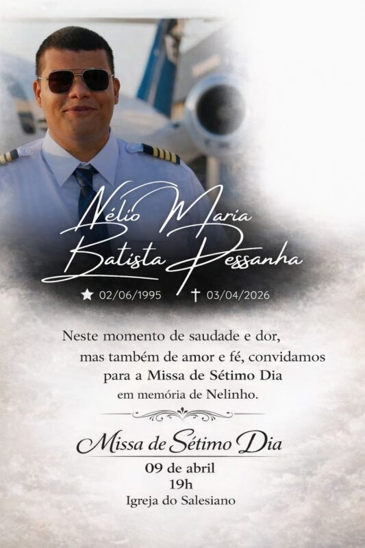 Falecido precocemente, aos 30 anos, em um trágico acidente com o avião de pequeno porte que pilotava, na última sexta-feira (3), no Rio Grande do Sul, em que morreram também os outros três ocupantes, Nélio Maria Batista Pessanha (confira aqui) terá sua missa de sétimo dia celebrada nesta quinta (9). Que começa às 19h, na Igreja do Salesiano, na avenida Dom Bosco, nº 49, Parque Tamandaré.
