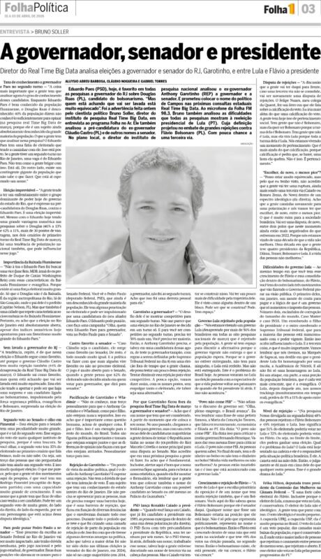 No plano local, o diretor do instituto de pesquisa nacional analisou o ex-governador Anthony Garotinho (REP) a governador e a senador. E prometeu colocar o nome do político de Campos nas próximas consultas estaduais Real Time Big Data. Ao microfone da Folha FM 98,3, Bruno também analisou as dificuldades que todas as pesquisas mostram à reeleição presidencial de Lula (PT). Cuja definição projetou no embate de grandes rejeições contra Flávio Bolsonaro (PL). Com pouca chance, hoje, a uma terceira via.