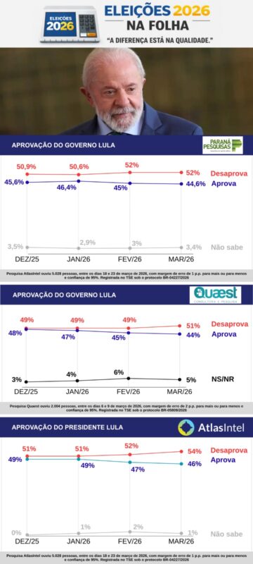 Tendência de aumento na desaprovação em três pesquisas — A mesma tendência de aumento na desaprovação do governo Lula é confirmada nas séries de pesquisas Quaest e AtlasIntel. Pela Quaest, o Lula 3 era desaprovado pela minoria apertada de 49% dos eleitores em dezembro. Que, três meses depois, cresceu 2 pontos até a maioria também apertada dos 51% que desaprovam em março.