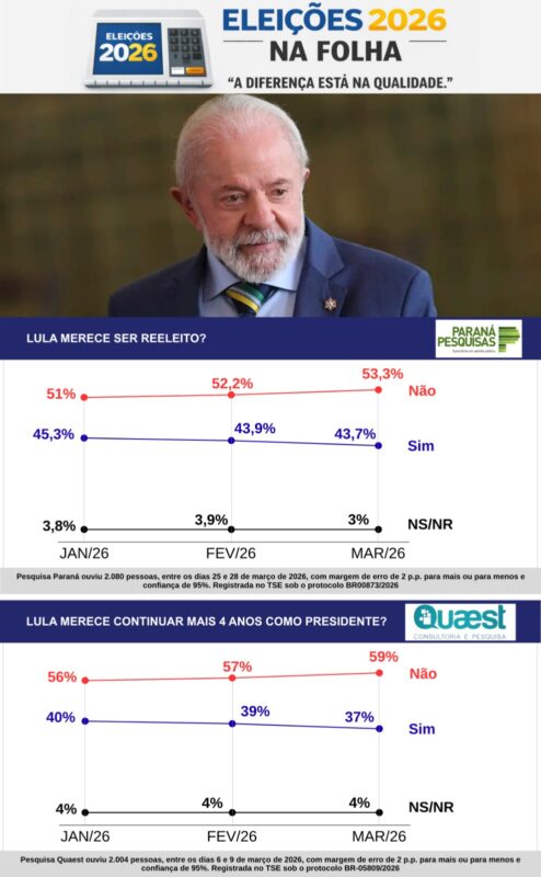 Cresce maioria contrária à reeleição de Lula — Vista na comparação com as pesquisas anteriores dos mesmos dois institutos, a tendência é de aumento nesses números contrários à reeleição do atual presidente. Na série Paraná, Lula não merecia renovar o mandato para 51% dos brasileiros em janeiro, 2,3 pontos a menos que os 53,3% de março. Na série Quaest, o petista não merecia se reeleger para 56% dos eleitores em janeiro, 3 pontos a menos que os 59% de março.