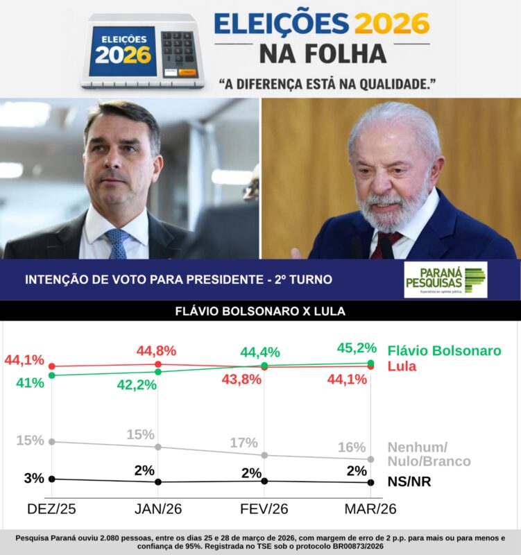 Hoje (30) foi divulgada a nova pesquisa presidencial Nexus de março. Nela, Lula (PT) lidera numericamente, mas em empate técnico com Flávio Bolsonaro (PL), o cenário hoje mais provável de primeiro turno: 41% do presidente a 38% do senador. E com um empate exato entre os dois na simulação de 2º turno: Lula 46% a 46% Flávio.