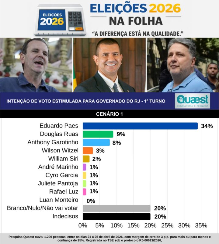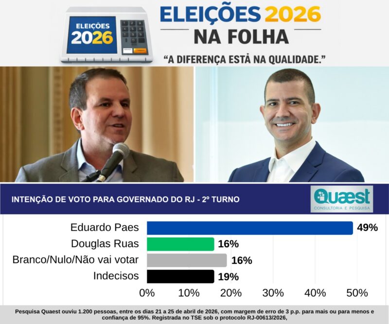 Dados da Datafolha e Paraná — Por sua vez, a Datafolha foi feita de 7 a 9 de abril, com 2.004 eleitores, com margem de erro de 2 pontos para mais ou menos e registro BR-03770/2026 no TSE. E a Paraná foi feita de 25 a 28 de março, com 2.080 eleitores, margem de erro de 2,2 pontos para mais ou menos e registro BR-00873/2026 no TSE.